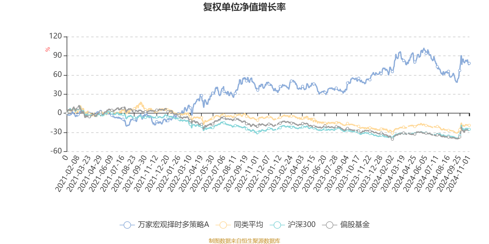截至11月1日,万家宏观择时多策略A近三个月复权单位净值增长率为8.77%,位于同类可比基金35/91;近半年复权单位净值增长率为-2.50%,位于同类可比基金69/91;近一年复权单位净值增长率为20.18%,位于同类可比基金13/84;近三年复权单位净值增长率为110.02%,位于同类可比基金1/61。