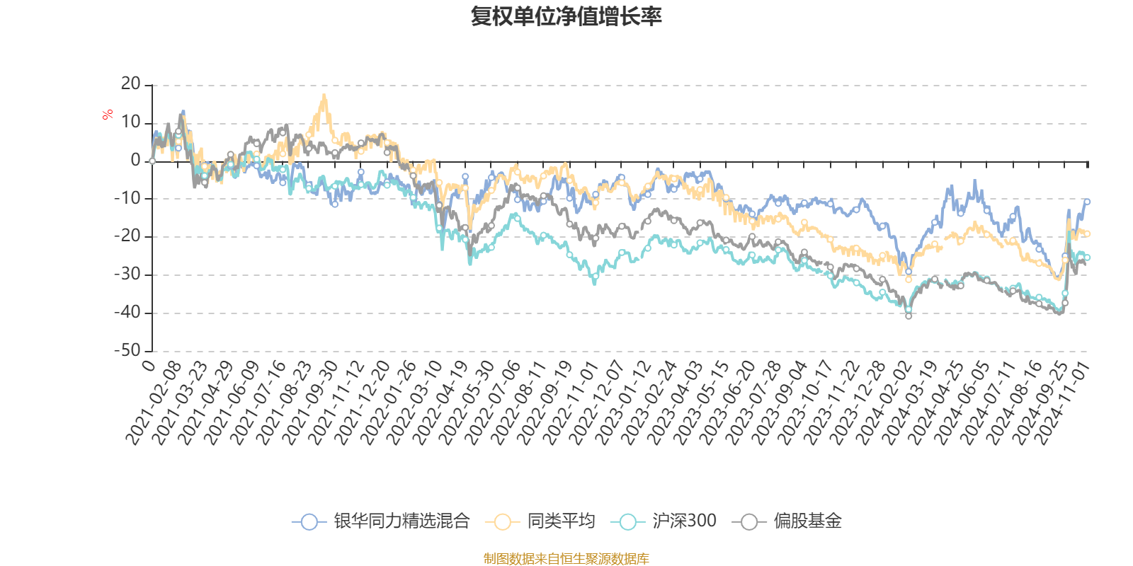 截至11月1日,银华同力精选混合近三个月复权单位净值增长率为8.83%,位于同类可比基金35/91;近半年复权单位净值增长率为3.31%,位于同类可比基金34/91;近一年复权单位净值增长率为2.19%,位于同类可比基金66/84;近三年复权单位净值增长率为-3.04%,位于同类可比基金24/61。