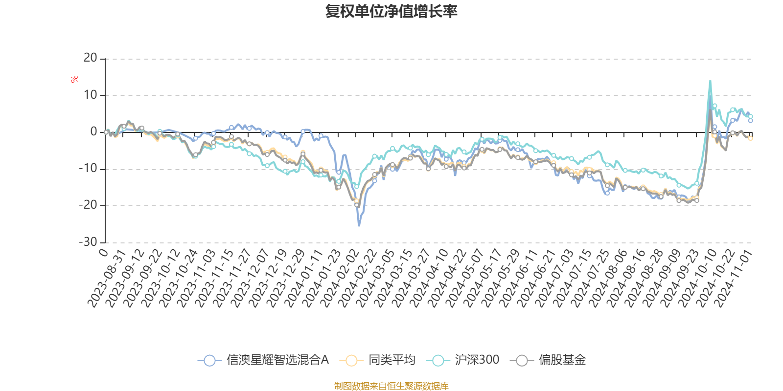 截至11月1日,信澳星耀智选混合A近三个月复权单位净值增长率为18.39%,位于同类可比基金84/536;近半年复权单位净值增长率为8.30%,位于同类可比基金144/535;近一年复权单位净值增长率为3.57%,位于同类可比基金181/470。