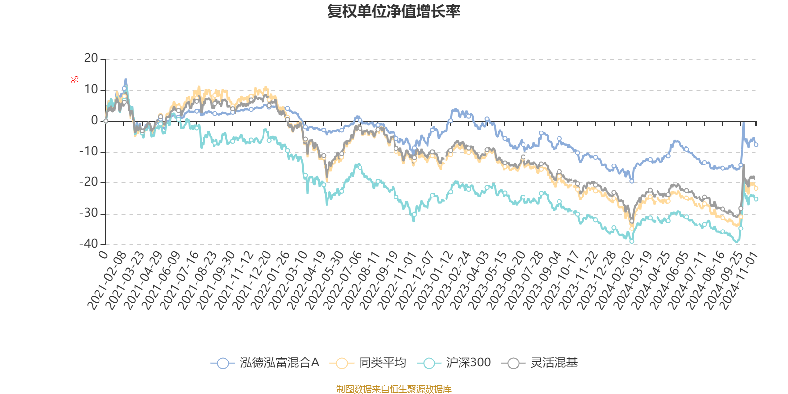 截至11月1日,泓德泓富混合A近三个月复权单位净值增长率为8.32%,位于同类可比基金592/920;近半年复权单位净值增长率为2.35%,位于同类可比基金508/920;近一年复权单位净值增长率为3.60%,位于同类可比基金399/920;近三年复权单位净值增长率为-11.09%,位于同类可比基金175/892。