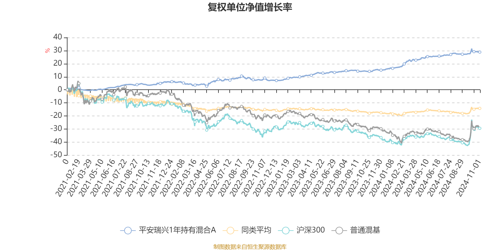 截至11月1日,平安瑞兴1年持有混合A近三个月复权单位净值增长率为0.70%,位于同类可比基金534/670;近半年复权单位净值增长率为3.63%,位于同类可比基金141/670;近一年复权单位净值增长率为13.02%,位于同类可比基金13/658;近三年复权单位净值增长率为23.77%,位于同类可比基金3/480。