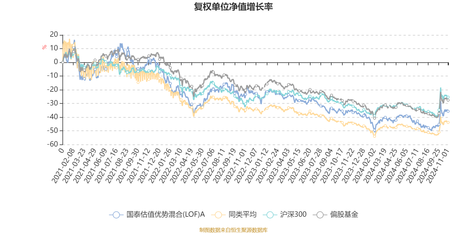 截至11月1日,国泰估值优势混合(LOF)A近三个月复权单位净值增长率为18.75%,位于同类可比基金25/256;近半年复权单位净值增长率为7.44%,位于同类可比基金63/256;近一年复权单位净值增长率为0.72%,位于同类可比基金128/255;近三年复权单位净值增长率为-33.99%,位于同类可比基金139/219。