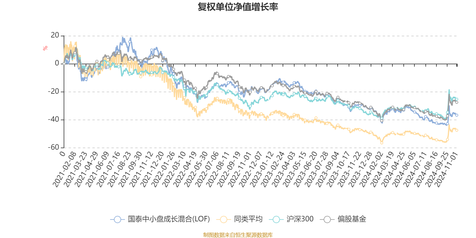 截至11月1日,国泰中小盘成长混合(LOF)近三个月复权单位净值增长率为5.35%,位于同类可比基金558/645;近半年复权单位净值增长率为-6.83%,位于同类可比基金621/644;近一年复权单位净值增长率为-8.97%,位于同类可比基金561/622;近三年复权单位净值增长率为-38.77%,位于同类可比基金290/389。