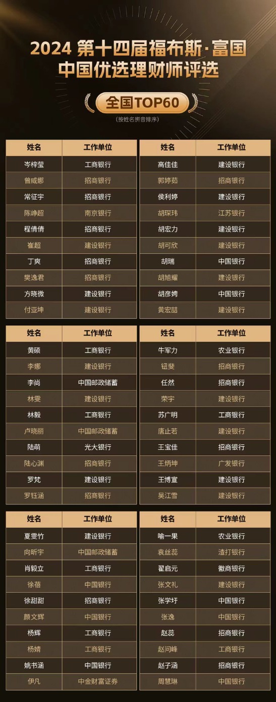 附“2024第十四届福布斯·富国中国优选理财师评选”全国TOP 60名单: