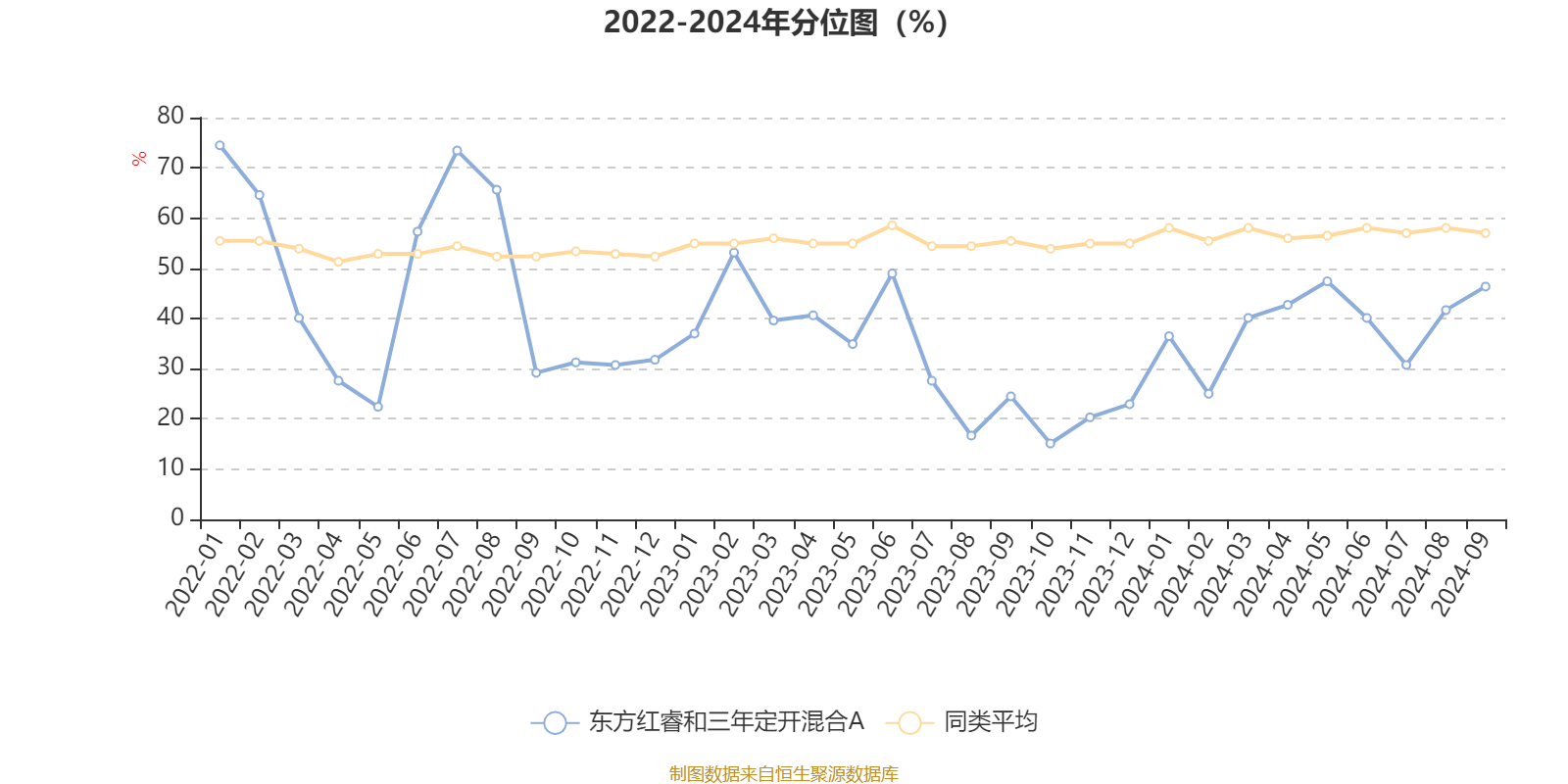 通过所选区间该基金净值增长率分位图,可以观察该基金与同类基金业绩比较情况。图为坐标原点到区间内某时点的净值增长率在同类基金中的分位数。