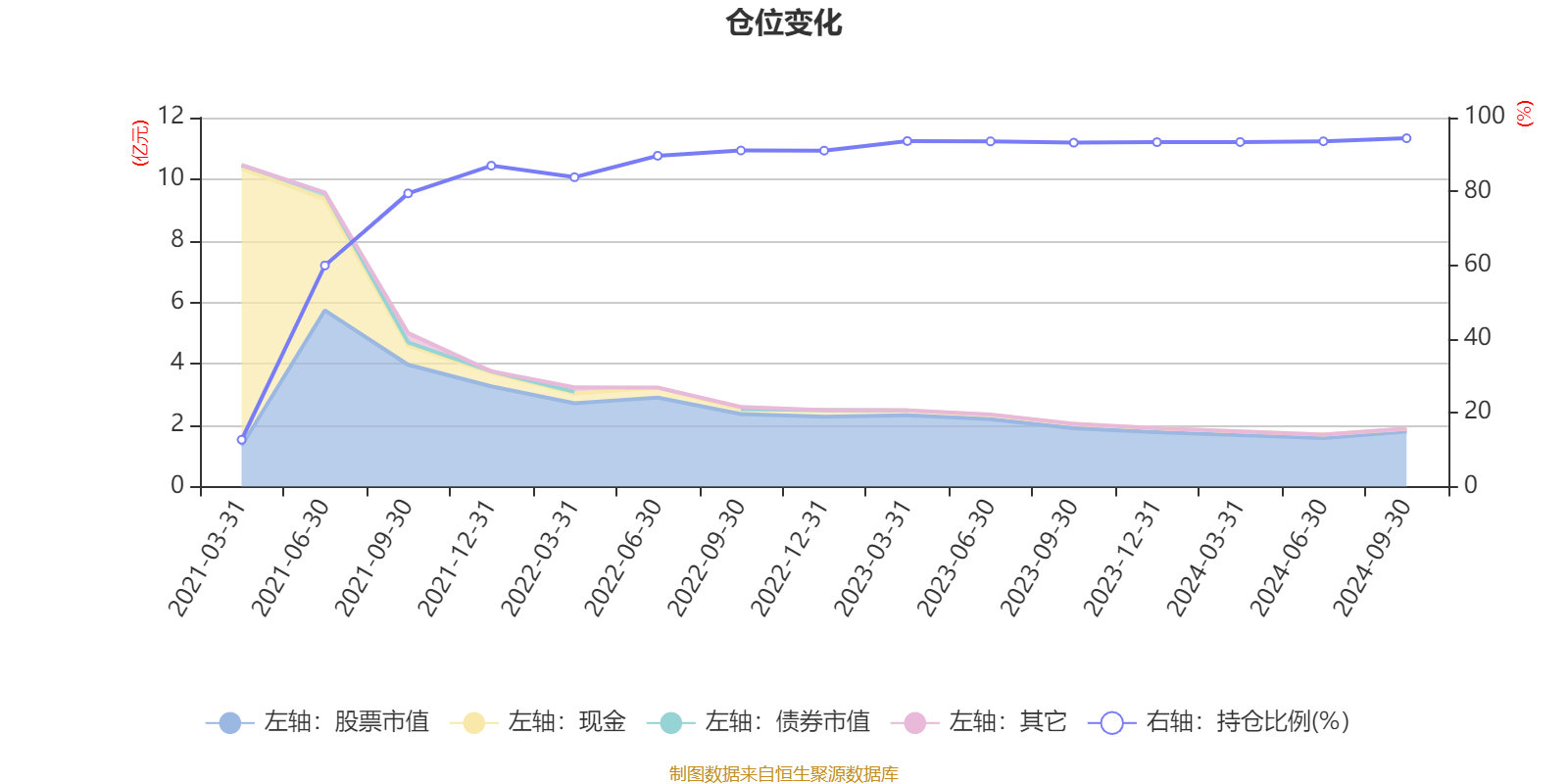 据定期报告数据统计,近三年平均股票仓位为91.48%,同类平均为84.96%。2024年三季度末基金达到94.41%的最高仓位,2021年一季度末最低,为12.7%。