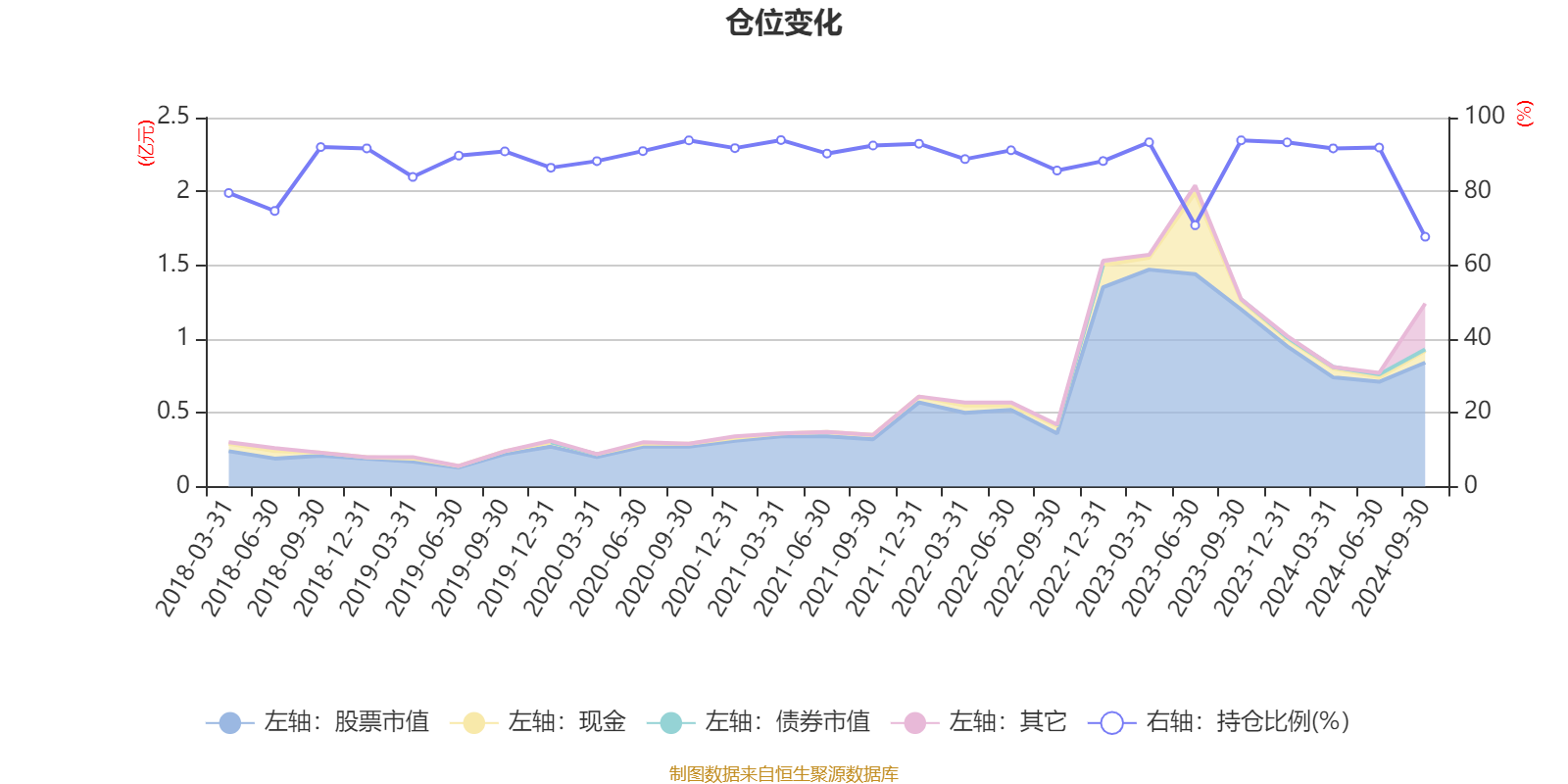 据定期报告数据统计,近三年平均股票仓位为87.43%,同类平均为85.76%。2021年一季度末基金达到93.91%的最高仓位,2024年三季度末最低,为67.7%。