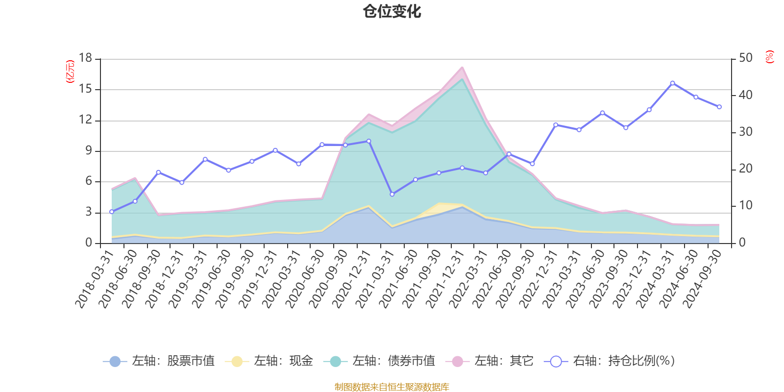 据定期报告数据统计,近三年平均股票仓位为30.92%,同类平均为18.65%。2024年一季度末基金达到43.42%的最高仓位,2018年一季度末最低,为8.56%。