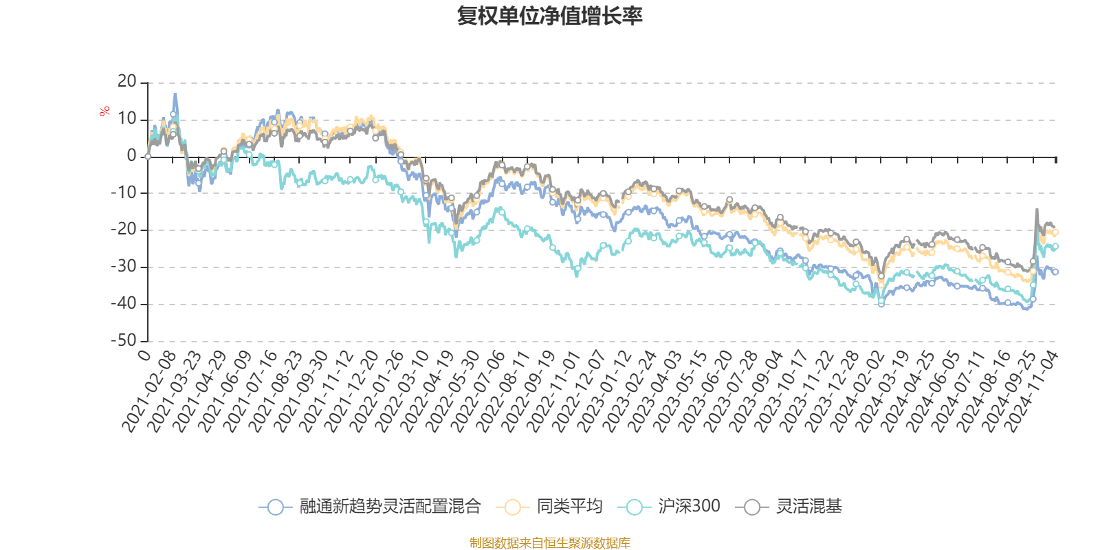 截至11月4日,融通新趋势灵活配置混合近三个月复权单位净值增长率为12.61%,位于同类可比基金494/920;近半年复权单位净值增长率为3.62%,位于同类可比基金500/920;近一年复权单位净值增长率为-2.03%,位于同类可比基金633/920;近三年复权单位净值增长率为-35.39%,位于同类可比基金664/892。