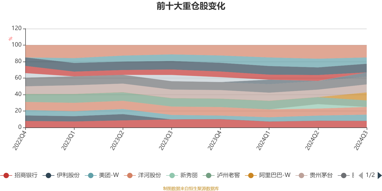 该基金持股集中度较高,且持股标的较为稳定,近2年前十大重仓股集中度长期超过60%。截至2024年三季度末,基金十大重仓股分别是五粮液、贵州茅台、阿里巴巴-W、腾讯控股、洋河股份、招商银行、泸州老窖、中国海洋石油、美团-W、山西汾酒。