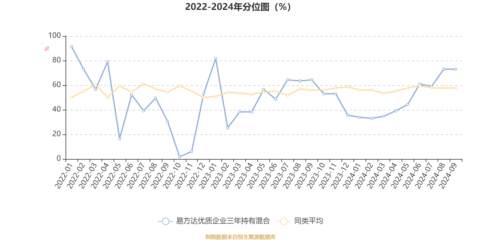 通过所选区间该基金净值增长率分位图,可以观察该基金与同类基金业绩比较情况。图为坐标原点到区间内某时点的净值增长率在同类基金中的分位数。