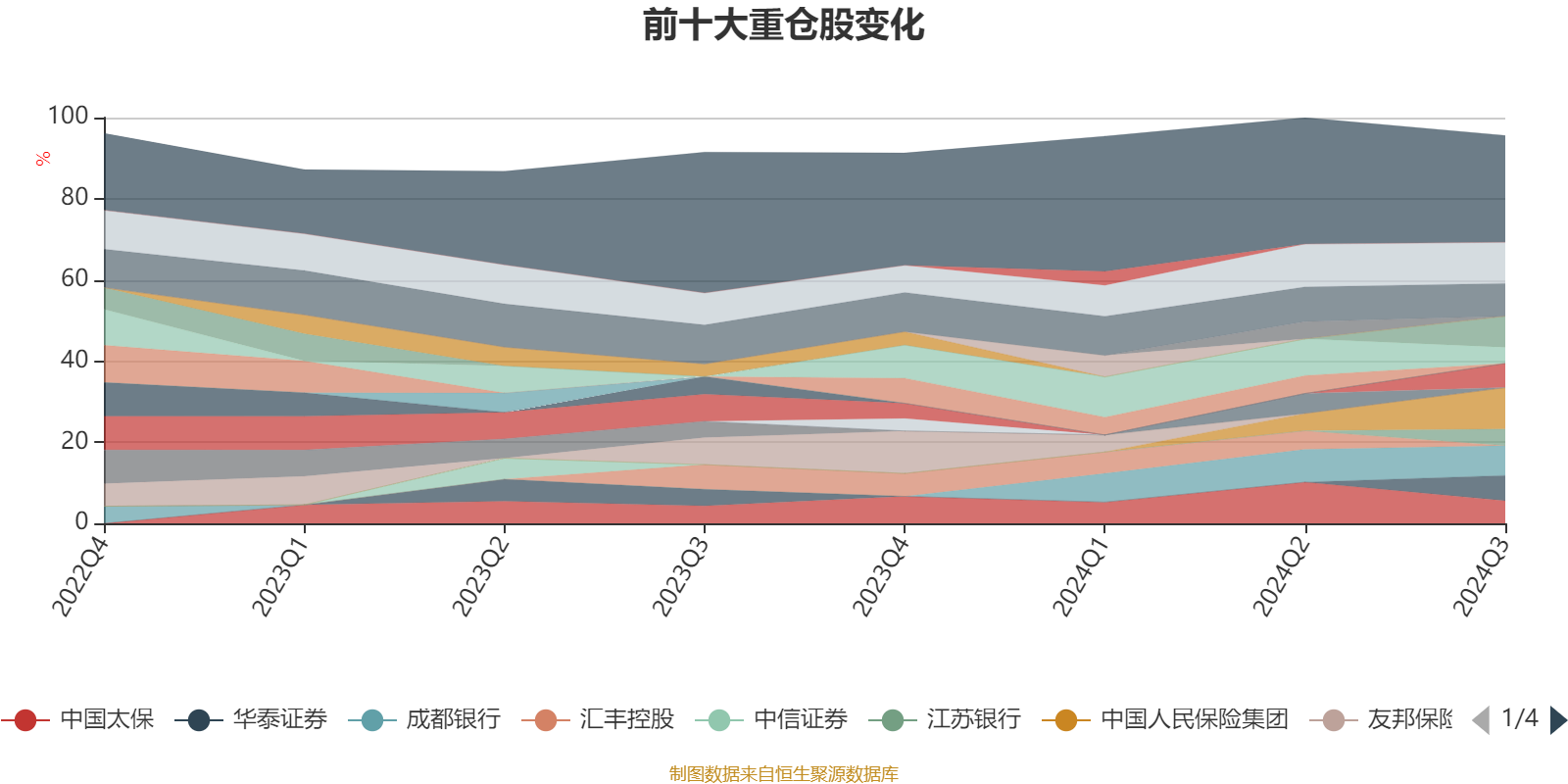 该基金持股集中度较高,近2年前十大重仓股集中度长期超过60%。截至2024年三季度末,基金十大重仓股分别是中国人民保险集团、招商银行、宁波银行、平安银行、成都银行、华泰证券、中国平安、中国太保、江苏银行、常熟银行。