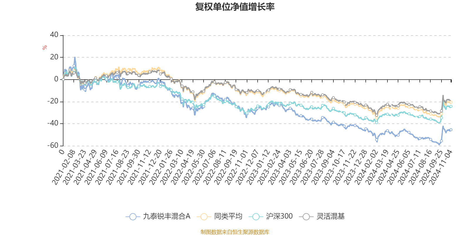 截至11月4日,九泰锐丰混合A近三个月复权单位净值增长率为16.14%,位于同类可比基金331/920;近半年复权单位净值增长率为6.10%,位于同类可比基金370/920;近一年复权单位净值增长率为-6.01%,位于同类可比基金769/920;近三年复权单位净值增长率为-44.54%,位于同类可比基金805/892。