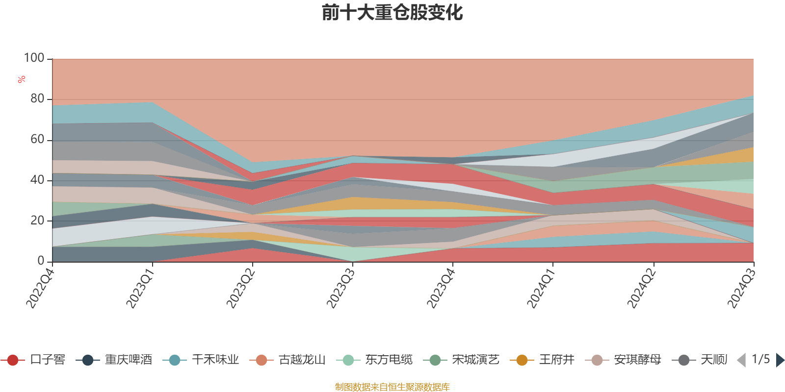 截至2024年三季度末,基金十大重仓股分别是贵州茅台、口子窖、舍得酒业、五粮液、顺鑫农业、水井坊、泸州老窖、山西汾酒、今世缘、洋河股份。