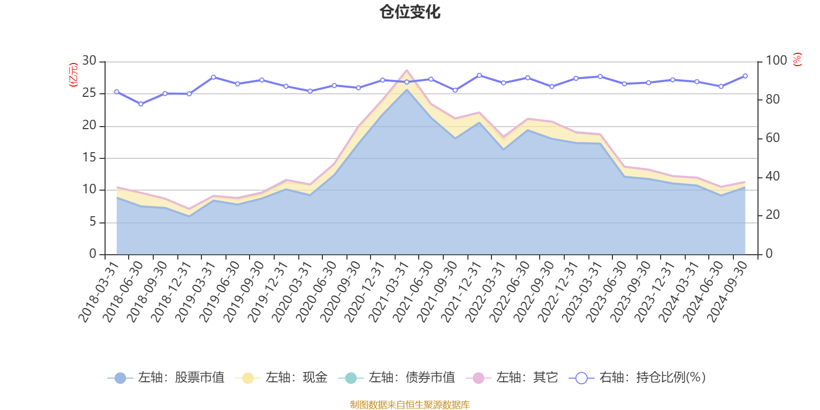 据定期报告数据统计,近三年平均股票仓位为90.08%,同类平均为87.01%。2021年末基金达到92.81%的最高仓位,2018年上半年末最低,为77.99%。