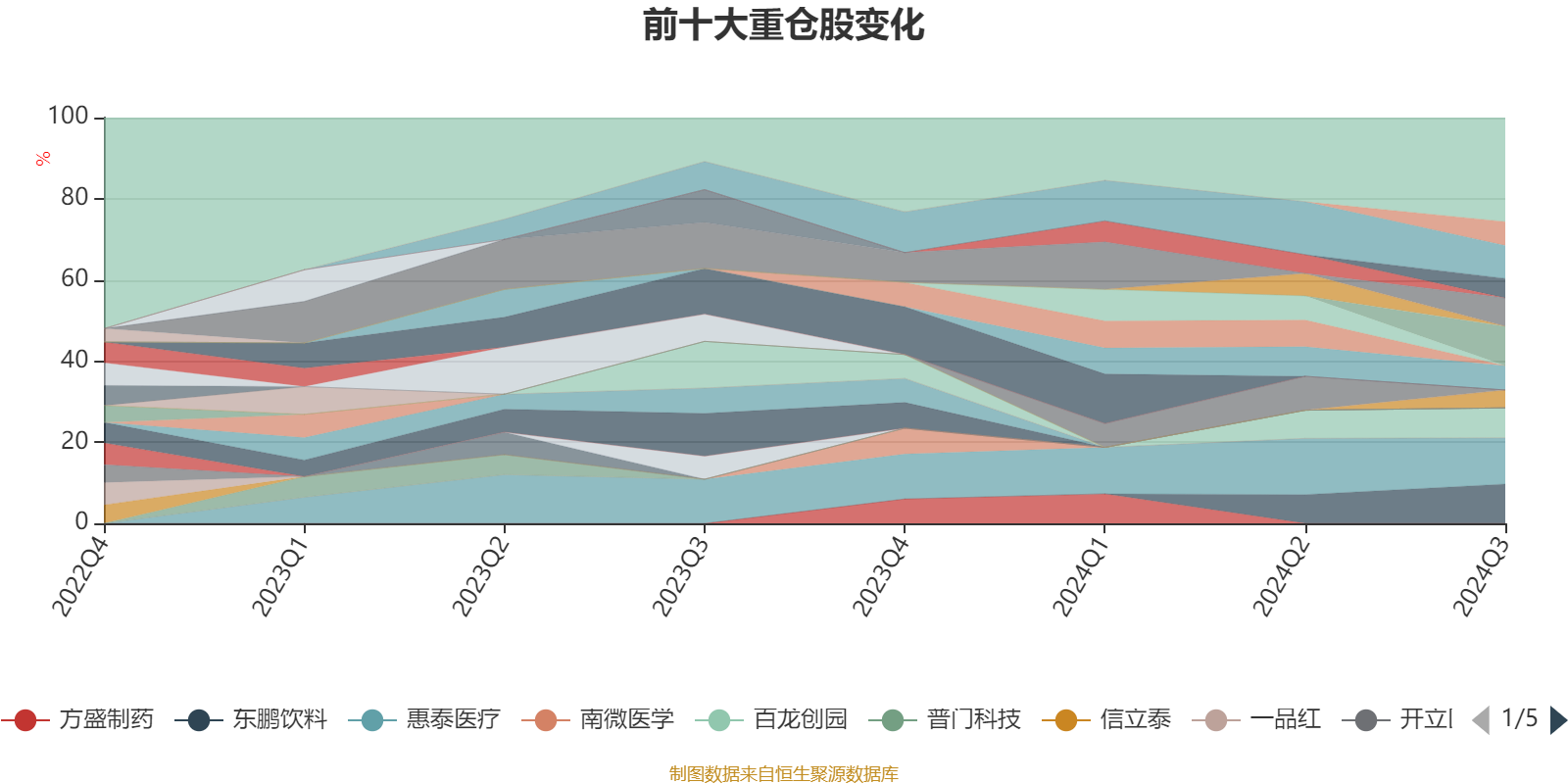 截至2024年三季度末,基金十大重仓股分别是惠泰医疗、华利集团、东鹏饮料、新产业、百龙创园、恒瑞医药、亚辉龙、阳光电源、科伦药业、比亚迪。