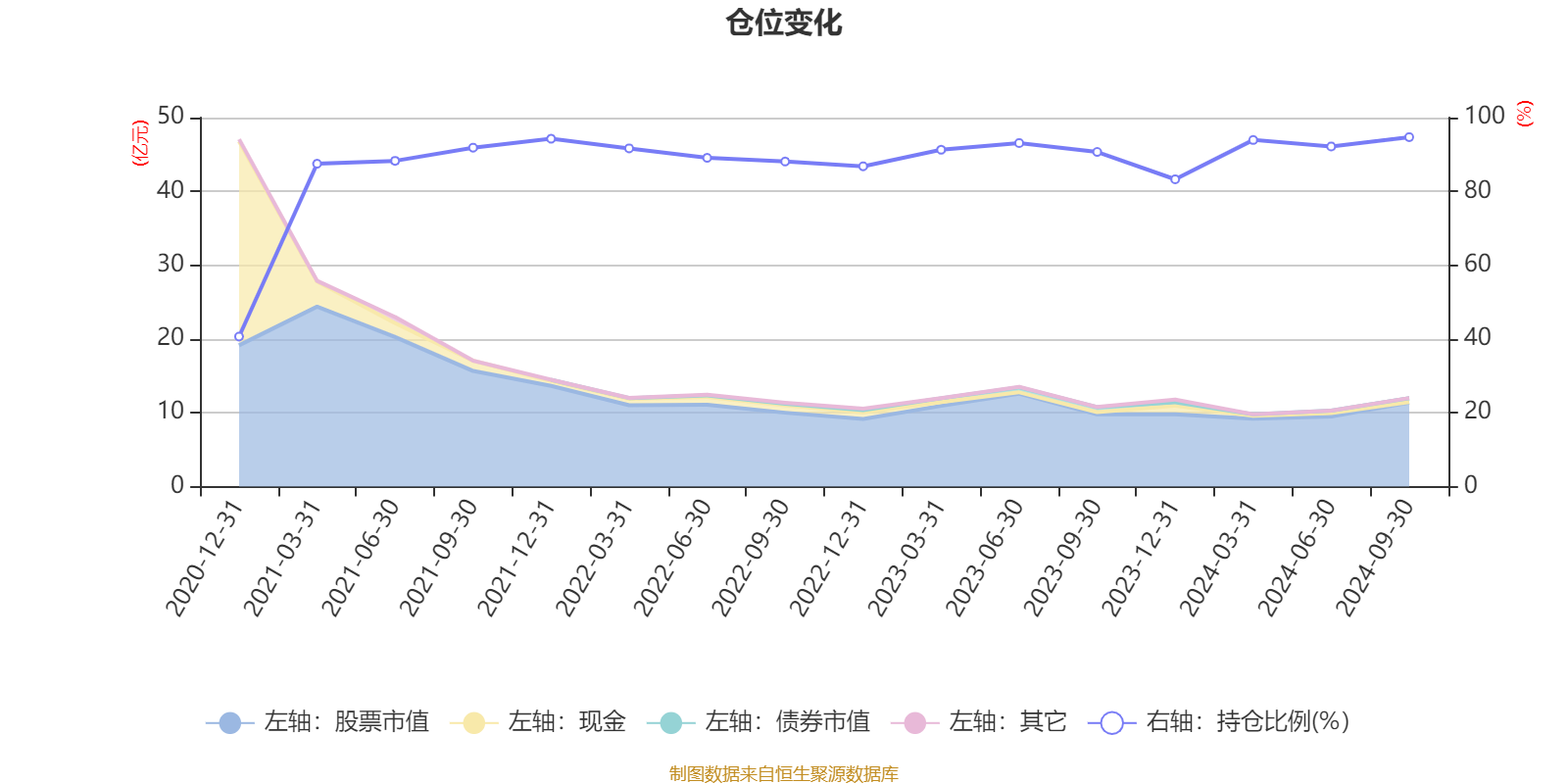 据定期报告数据统计,近三年平均股票仓位为90.76%,同类平均为84.64%。2024年三季度末基金达到94.71%的最高仓位,2020年末最低,为40.66%。