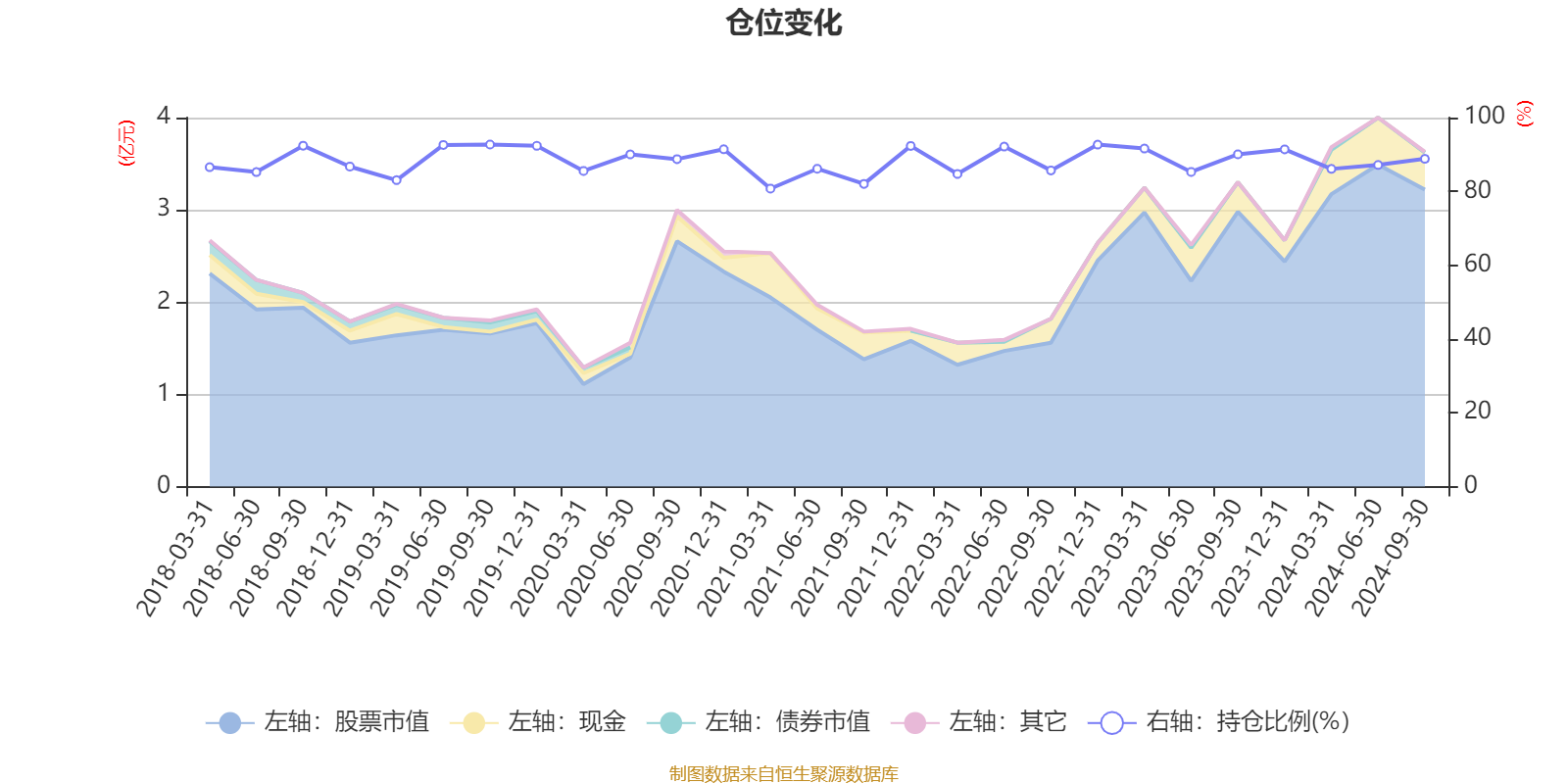 据定期报告数据统计,近三年平均股票仓位为89%,同类平均为88.15%。2019年三季度末基金达到92.7%的最高仓位,2021年一季度末最低,为80.75%。