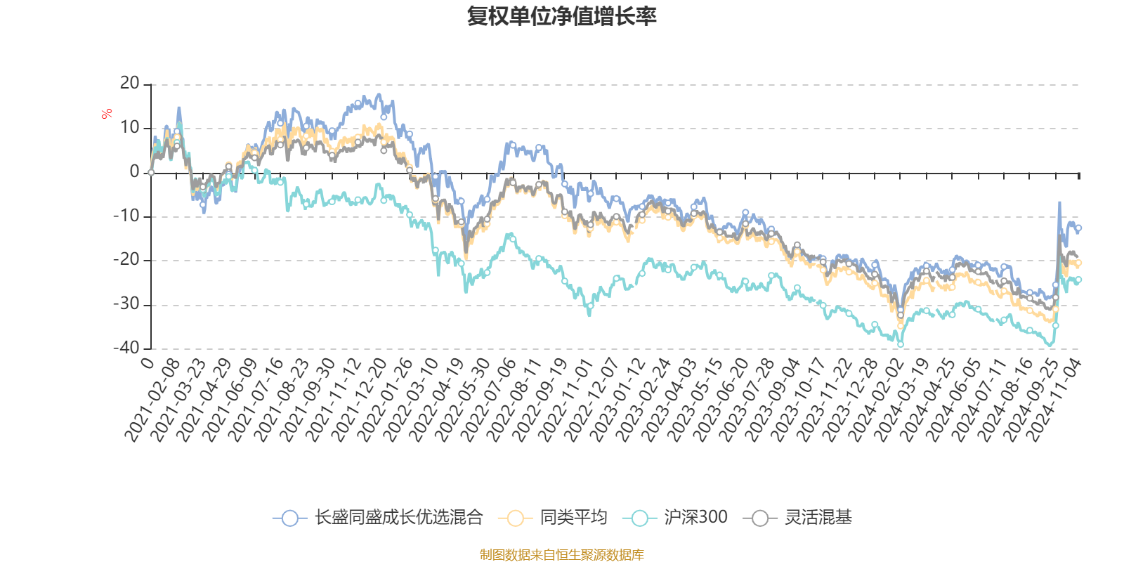 截至11月4日,长盛同盛成长优选混合近三个月复权单位净值增长率为17.76%,位于同类可比基金257/920;近半年复权单位净值增长率为8.69%,位于同类可比基金255/920;近一年复权单位净值增长率为9.51%,位于同类可比基金219/920;近三年复权单位净值增长率为-24.32%,位于同类可比基金414/892。