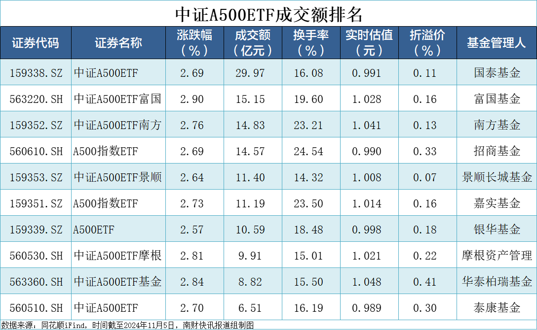 数据显示,截至11月4日,首批10只中证A500ETF规模合计达到723.25亿元。其中,国泰中证A500ETF规模为183.37亿元,景顺长城中证A500ETF、富国中证A500ETF规模均超过76亿元。