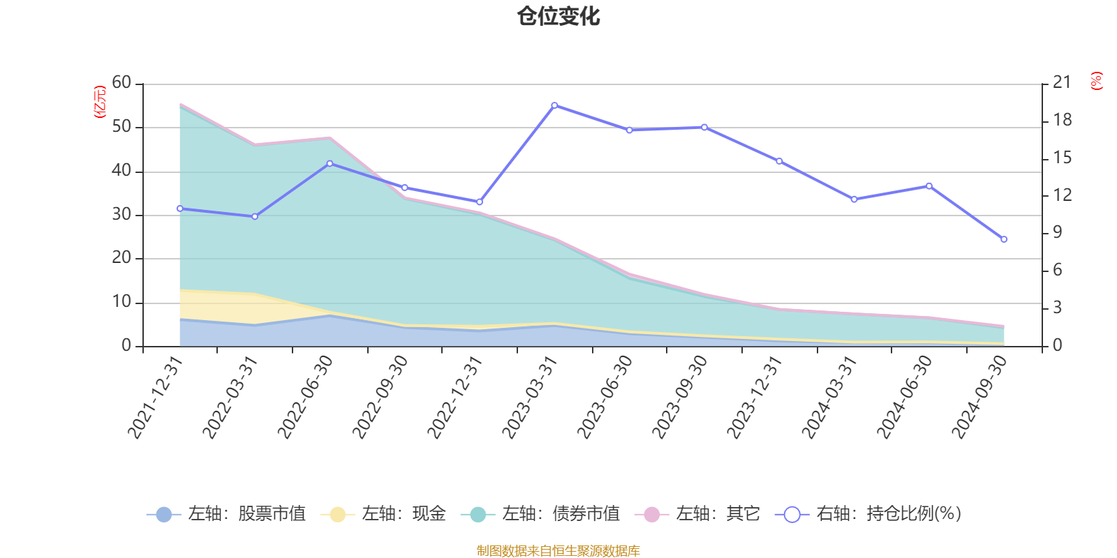 据定期报告数据统计,近三年平均股票仓位为13.52%,同类平均为18.77%。2023年一季度末基金达到19.27%的最高仓位,2024年三季度末最低,为8.56%。