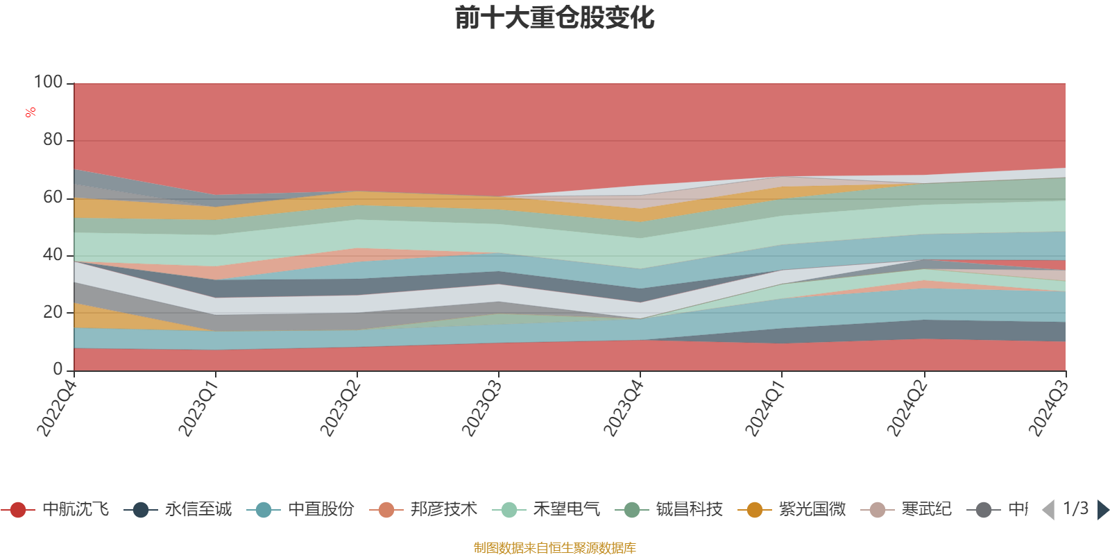 该基金持股集中度较高,近2年前十大重仓股集中度长期超过60%。截至2024年三季度末,基金十大重仓股分别是湘电股份、中直股份、中航沈飞、中科星图、航发动力、永信至诚、寒武纪、禾望电气、中航西飞、振芯科技。