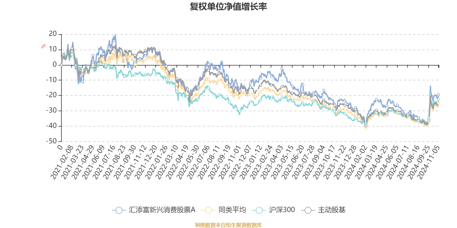截至11月5日,汇添富新兴消费股票A近三个月复权单位净值增长率为21.64%,位于同类可比基金73/166;近半年复权单位净值增长率为6.15%,位于同类可比基金114/166;近一年复权单位净值增长率为4.88%,位于同类可比基金95/164;近三年复权单位净值增长率为-23.82%,位于同类可比基金74/150。