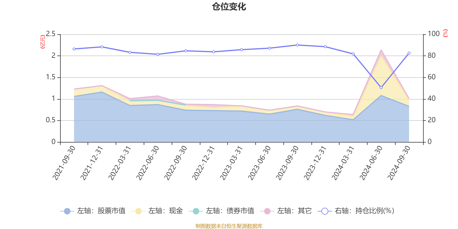 据定期报告数据统计,近三年平均股票仓位为82.38%,同类平均为87.19%。2023年三季度末基金达到90.13%的最高仓位,2024年上半年末最低,为50.6%。