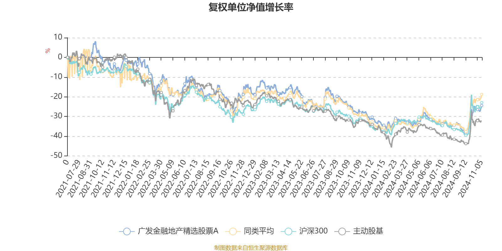 截至11月5日,广发金融地产精选股票A近三个月复权单位净值增长率为16.06%,位于同类可比基金5/6;近半年复权单位净值增长率为12.36%,位于同类可比基金6/6;近一年复权单位净值增长率为5.05%,位于同类可比基金5/6;近三年复权单位净值增长率为-19.27%,位于同类可比基金3/5。