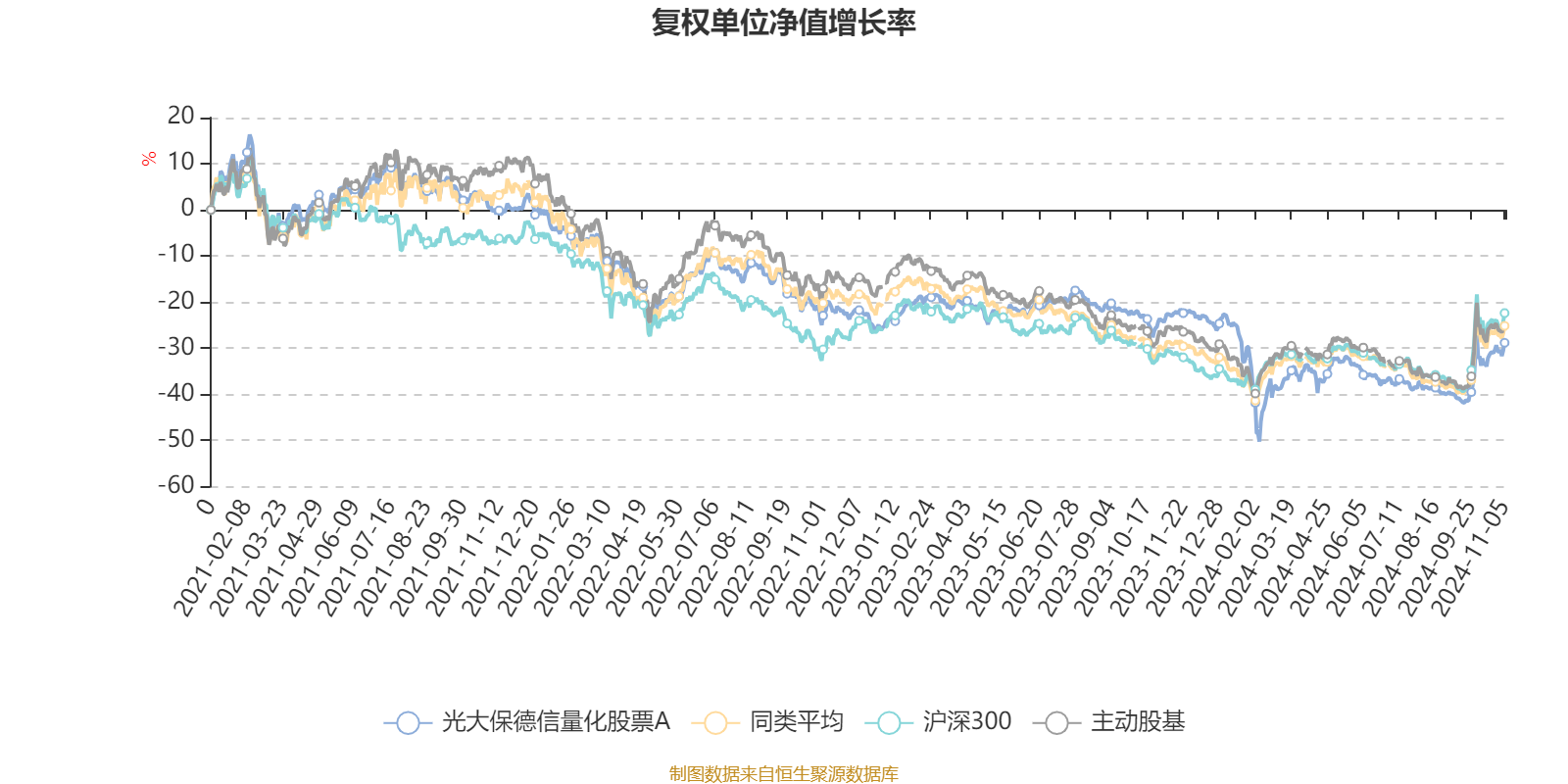 截至11月5日,光大保德信量化股票A近三个月复权单位净值增长率为16.69%,位于同类可比基金116/166;近半年复权单位净值增长率为7.41%,位于同类可比基金104/166;近一年复权单位净值增长率为-6.77%,位于同类可比基金148/164;近三年复权单位净值增长率为-28.61%,位于同类可比基金93/150。