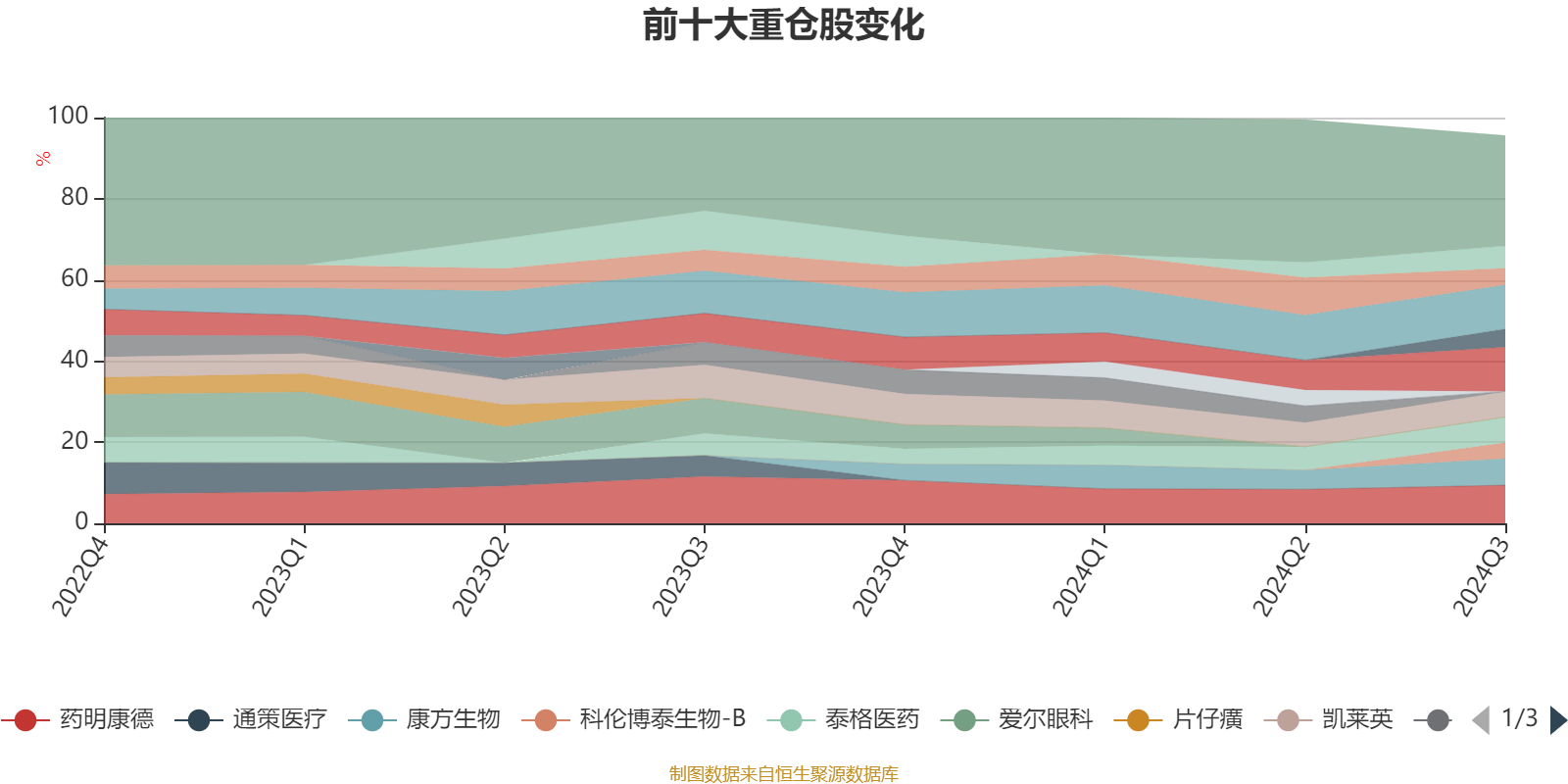 该基金持股集中度较高,且持股标的较为稳定,近2年前十大重仓股集中度长期超过60%。截至2024年三季度末,基金十大重仓股分别是康龙化成、恒瑞医药、药明康德、康方生物、凯莱英、泰格医药、药明生物、药明合联、迈瑞医疗、科伦博泰生物-B。