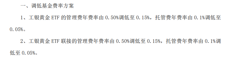同一天,工银瑞信基金还调低工银黄金ETF和工银黄金ETF联接基金的管理费和托管费。其中,该基金的年管理费率从0.50%调低至 0.15%,托管费年费率由0.10%调低至0.05%。