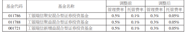 比如,工银瑞信基金11月5日公告称,决定自2024年11月5日起,调低工银瑞信聚安混合、工银瑞信聚益混合、工银瑞信新增益混合的管理费率和托管费率。