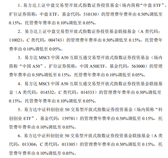 今日,易方达基金公告,将易方达中盘 ETF、易方达中国 A50ETF等6只基金的管理费年费率,统一由0.50%调低至0.15%。