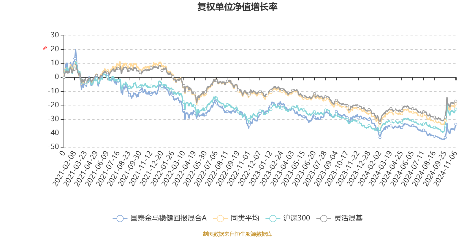 截至11月6日,国泰金马稳健回报混合A近三个月复权单位净值增长率为13.74%,位于同类可比基金577/920;近半年复权单位净值增长率为-0.08%,位于同类可比基金693/920;近一年复权单位净值增长率为-8.00%,位于同类可比基金809/920;近三年复权单位净值增长率为-26.13%,位于同类可比基金492/892。