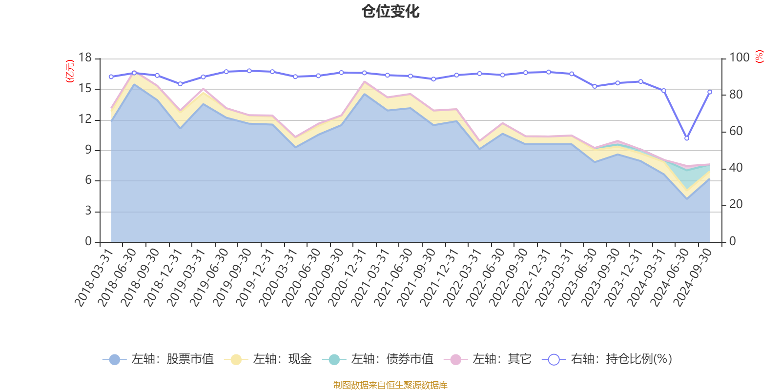 据定期报告数据统计,近三年平均股票仓位为85.84%,同类平均为79.77%。2019年三季度末基金达到93.29%的最高仓位,2024年上半年末最低,为56.55%。