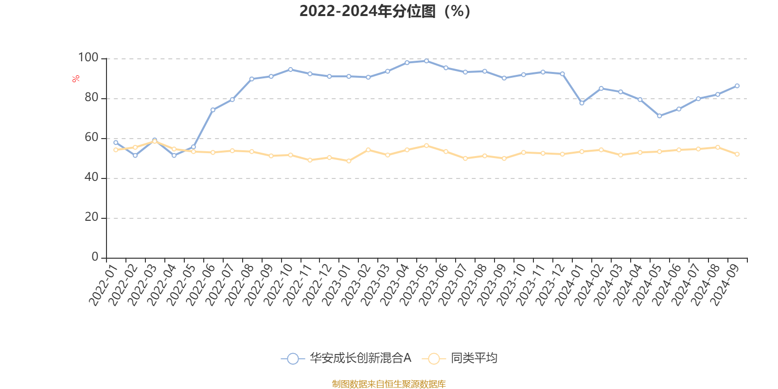 通过所选区间该基金净值增长率分位图,可以观察该基金与同类基金业绩比较情况。图为坐标原点到区间内某时点的净值增长率在同类基金中的分位数。