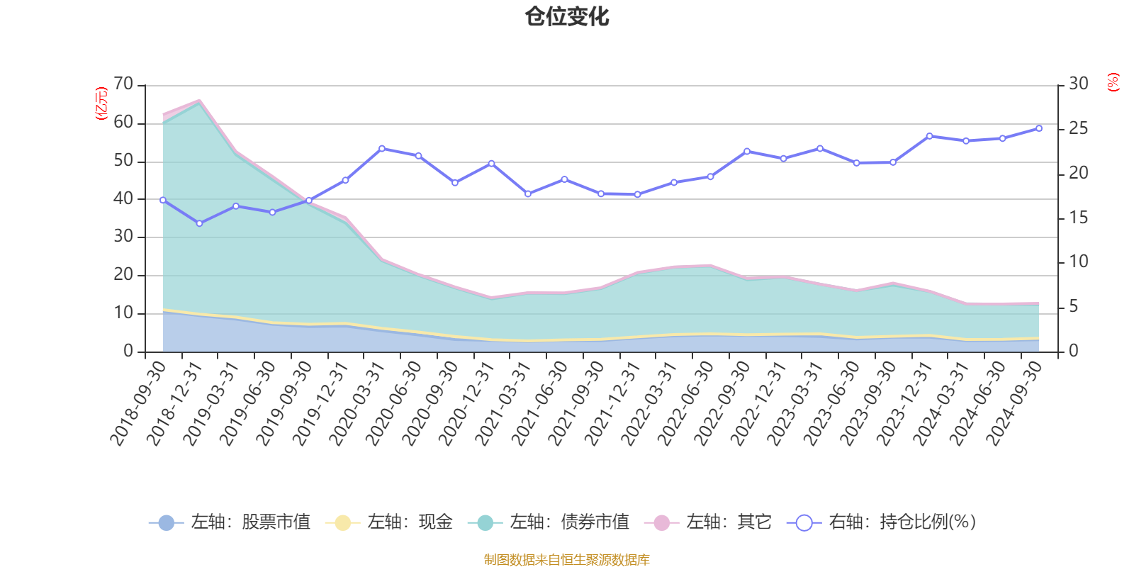 据定期报告数据统计,近三年平均股票仓位为21.94%,同类平均为18.77%。2024年三季度末基金达到25.13%的最高仓位,2018年末最低,为14.44%。