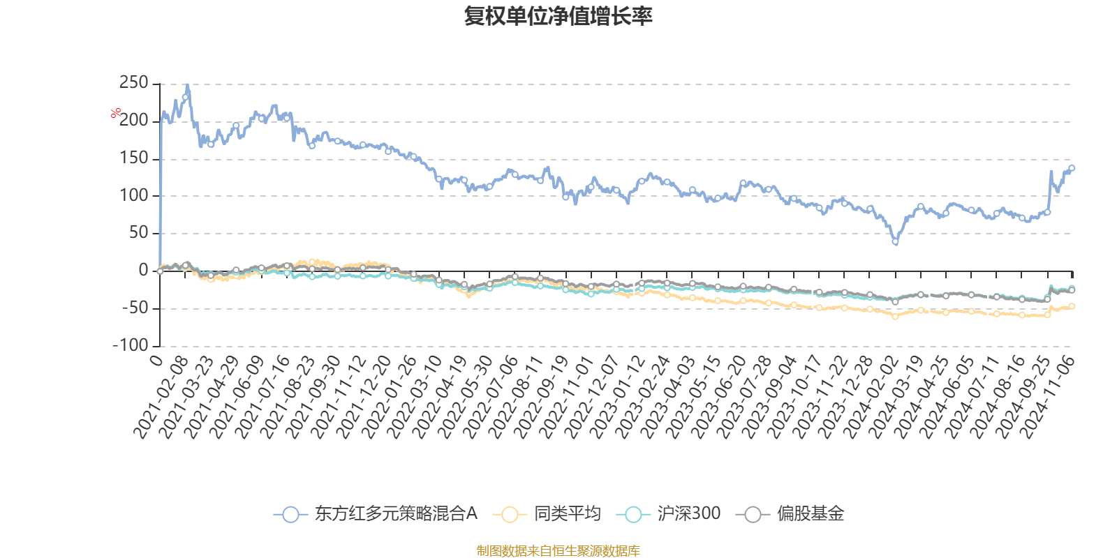 截至11月6日,东方红多元策略混合A近三个月复权单位净值增长率为34.67%,位于同类可比基金20/182;近半年复权单位净值增长率为25.37%,位于同类可比基金7/181;近一年复权单位净值增长率为22.30%,位于同类可比基金8/169;近三年复权单位净值增长率为-10.23%,位于同类可比基金2/101。