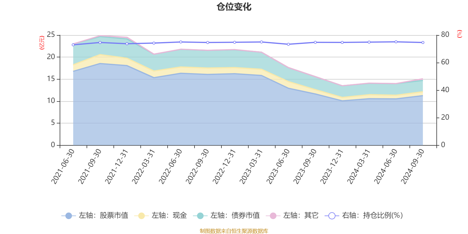 据定期报告数据统计,近三年平均股票仓位为74.57%,同类平均为83.55%。2024年上半年末基金达到75.13%的最高仓位,2021年上半年末最低,为72.94%。