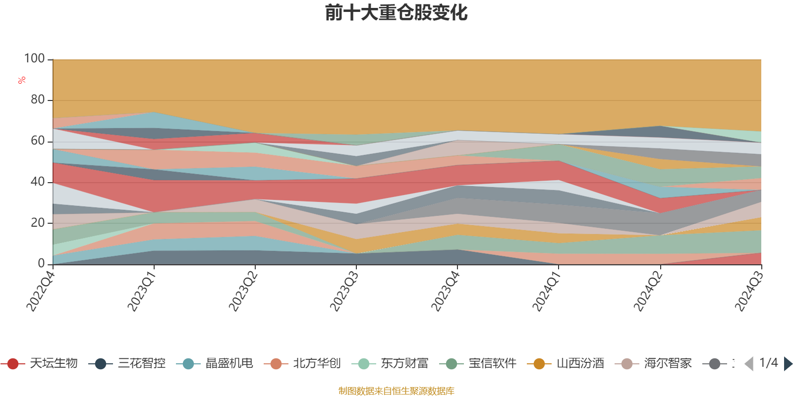 该基金持股集中度较高,近2年前十大重仓股集中度长期超过60%。截至2024年三季度末,基金十大重仓股分别是宝信软件、海尔智家、山西汾酒、顺络电子、立讯精密、安琪酵母、山东药玻、中国核电、天坛生物、迈瑞医疗。