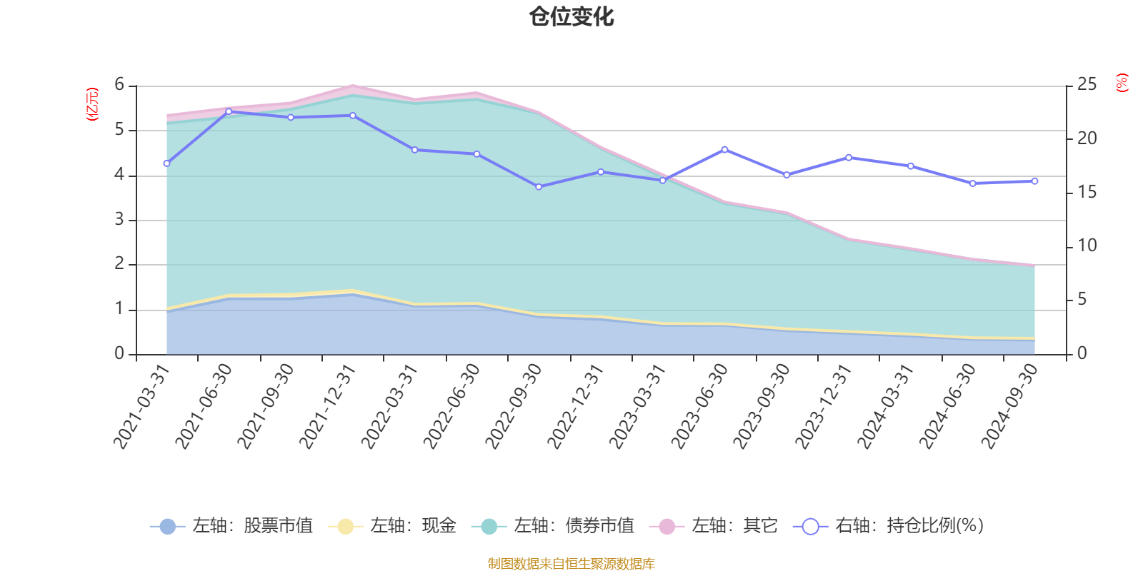 据定期报告数据统计,近三年平均股票仓位为17.69%,同类平均为18.77%。2021年上半年末基金达到22.6%的最高仓位,2022年三季度末最低,为15.59%。