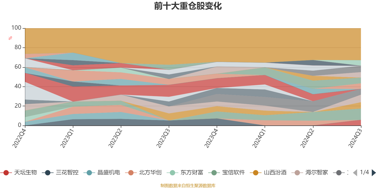 该基金持股集中度较高,近2年前十大重仓股集中度长期超过60%。截至2024年三季度末,基金十大重仓股分别是宝信软件、海尔智家、顺络电子、山西汾酒、立讯精密、山东药玻、安琪酵母、天坛生物、迈瑞医疗、同仁堂。