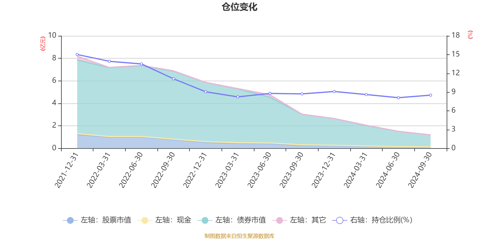 据定期报告数据统计,近三年平均股票仓位为10.22%,同类平均为18.77%。2021年末基金达到15.02%的最高仓位,2024年上半年末最低,为8.1%。