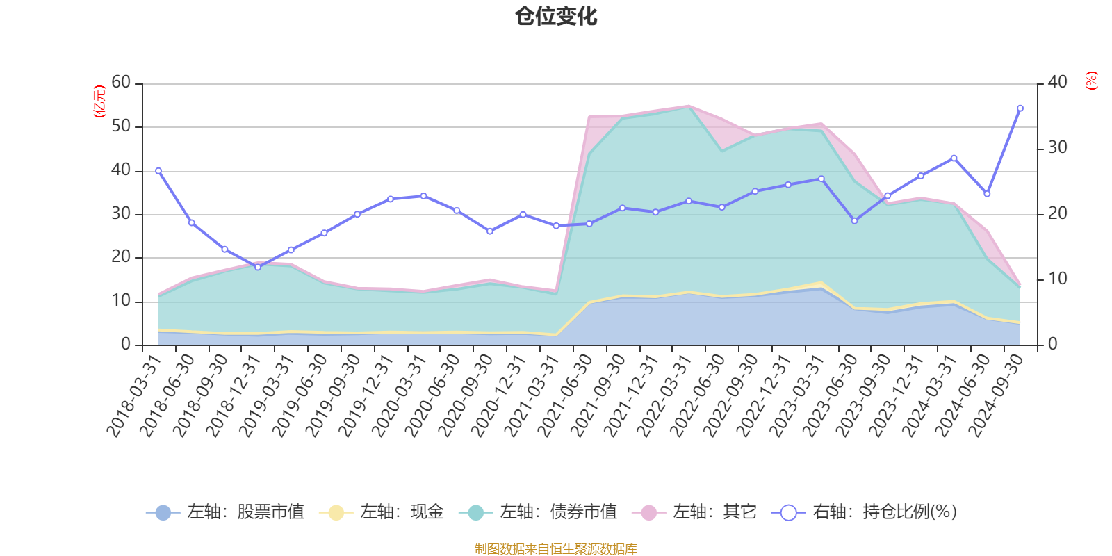 据定期报告数据统计,近三年平均股票仓位为24.37%,同类平均为18.77%。2024年三季度末基金达到36.21%的最高仓位,2018年末最低,为11.9%。