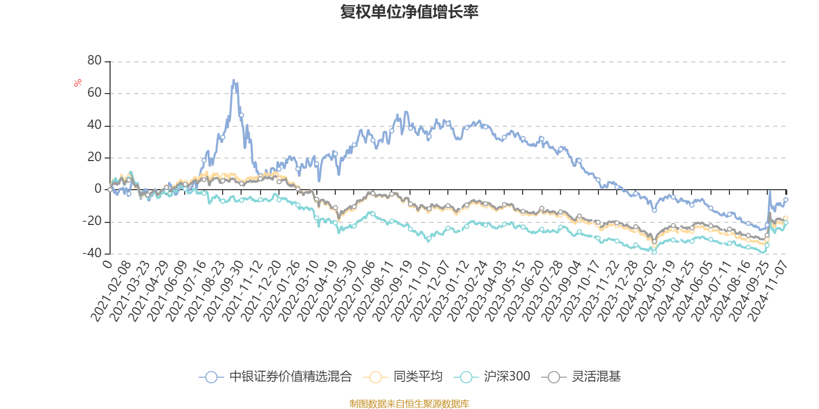 截至11月7日,中银证券价值精选混合近三个月复权单位净值增长率为17.71%,位于同类可比基金483/920;近半年复权单位净值增长率为0.20%,位于同类可比基金746/920;近一年复权单位净值增长率为-10.43%,位于同类可比基金858/920;近三年复权单位净值增长率为-15.31%,位于同类可比基金311/892。