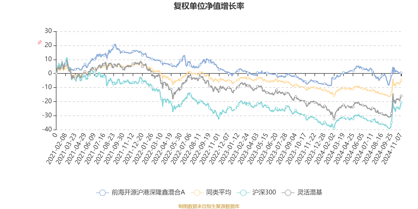 截至11月7日,前海开源沪港深隆鑫混合A近三个月复权单位净值增长率为4.68%,位于同类可比基金70/108;近半年复权单位净值增长率为-2.80%,位于同类可比基金94/108;近一年复权单位净值增长率为5.55%,位于同类可比基金46/108;近三年复权单位净值增长率为-12.21%,位于同类可比基金77/107。