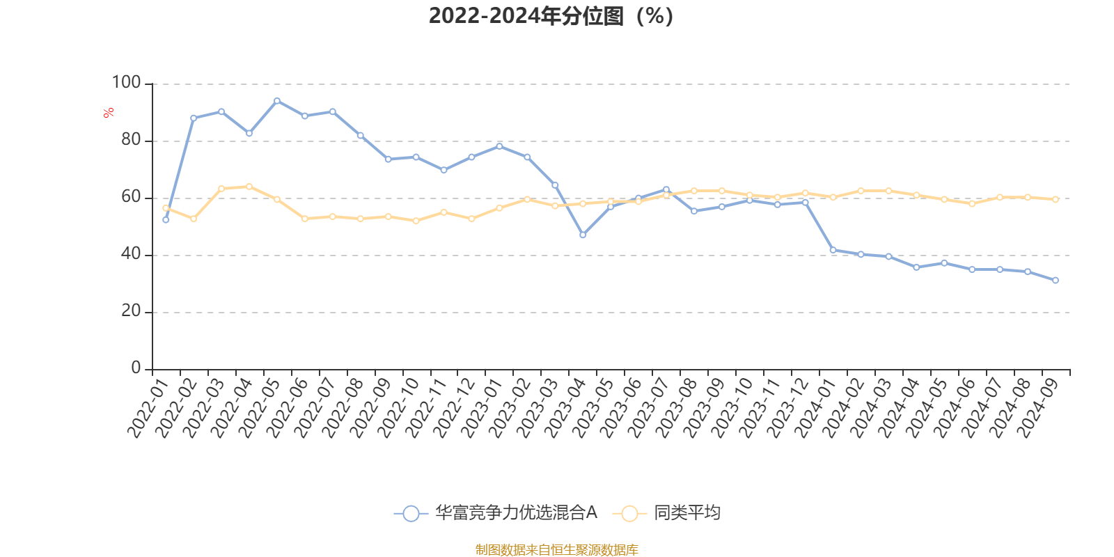 通过所选区间该基金净值增长率分位图,可以观察该基金与同类基金业绩比较情况。图为坐标原点到区间内某时点的净值增长率在同类基金中的分位数。