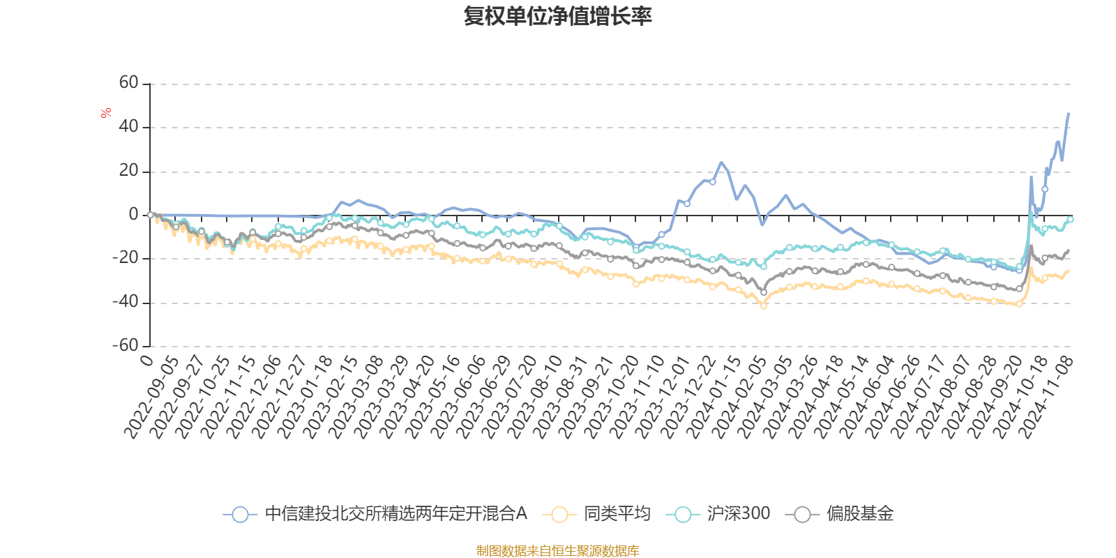 截至11月7日,中信建投北交所精选两年定开混合A近三个月复权单位净值增长率为83.06%,位于同类可比基金4/645;近半年复权单位净值增长率为58.55%,位于同类可比基金5/644;近一年复权单位净值增长率为68.11%,位于同类可比基金5/622。