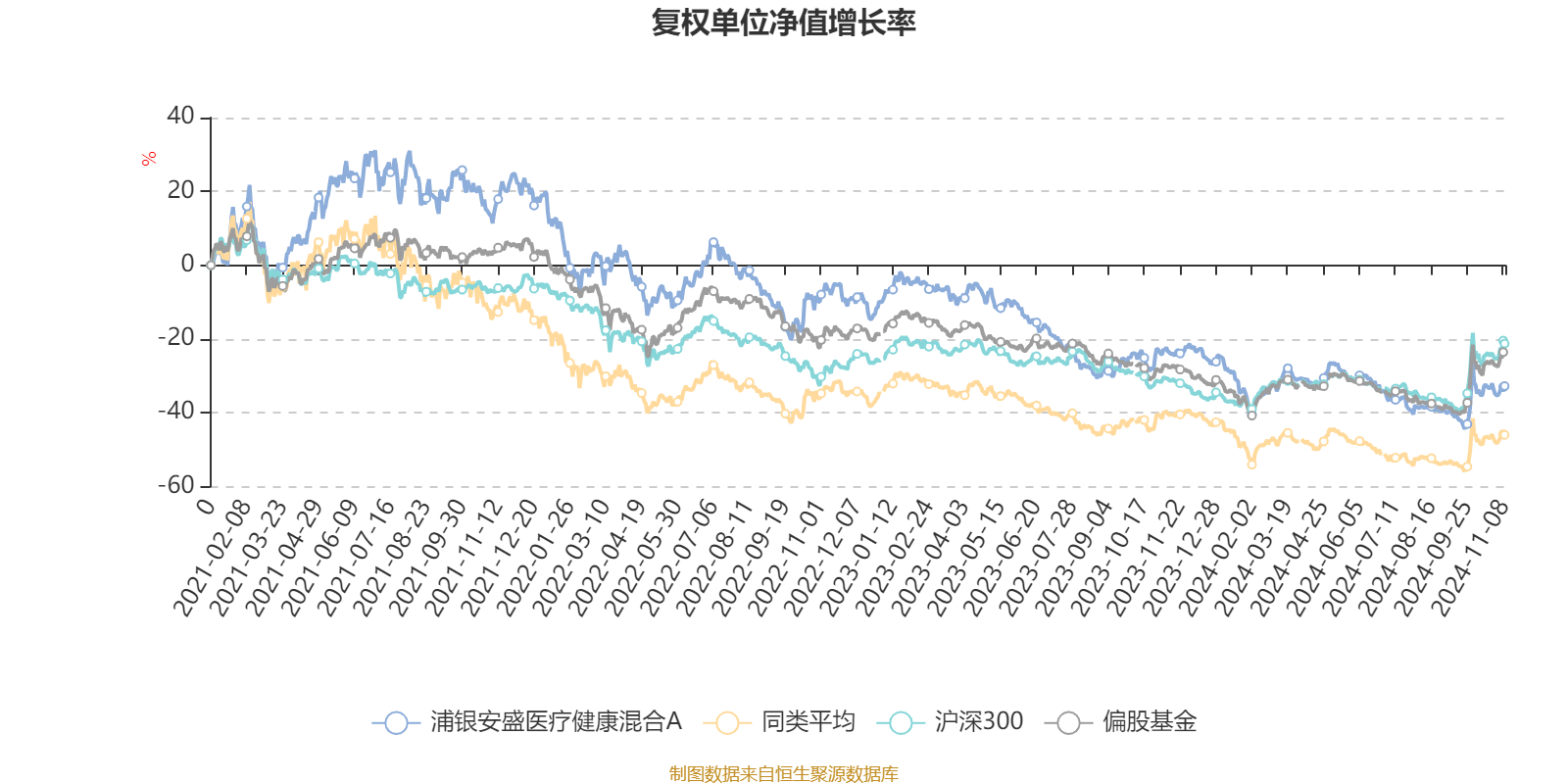 截至11月8日,浦银安盛医疗健康混合A近三个月复权单位净值增长率为8.96%,位于同类可比基金96/129;近半年复权单位净值增长率为-8.07%,位于同类可比基金120/129;近一年复权单位净值增长率为-13.51%,位于同类可比基金83/123;近三年复权单位净值增长率为-39.60%,位于同类可比基金70/91。